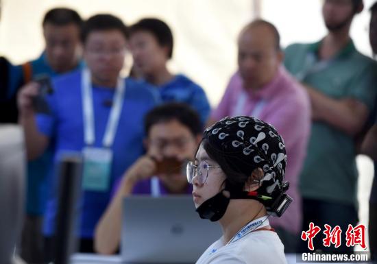 一名參賽選手在2019世界機器人大賽“BCI腦控機器人大賽”比賽中。