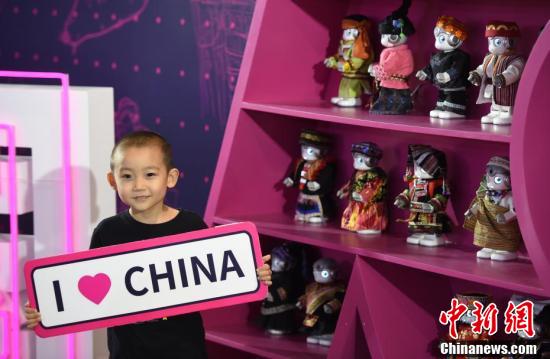 8月23日,一名小朋友在“民族風”機器人展區與展品合影。當天,2019世界機器人大會繼續在北京亦創國際會展中心舉行。(中新社記者 侯宇 攝)
