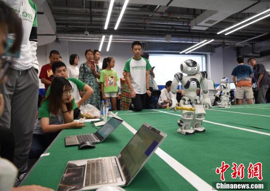 小選手們在2019世界機器人大賽“青少年機器人設計大賽——綠茵小將賽”比賽中操控自己的機器人。