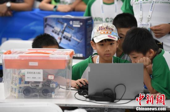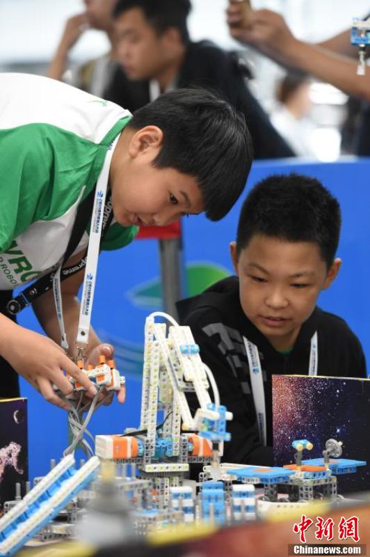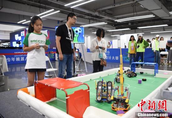 兩名小選手在2019世界機器人大賽“青少年機器人設計大賽”中操控自己設計的機器人。