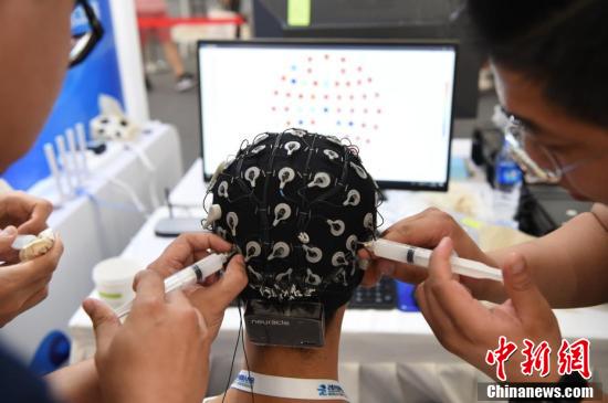 團隊成員為一名參賽選手佩帶的腦控設備注射導電膏,該選手即將參加在北京舉行的2019世界機器人大賽“BCI腦控機器人大賽”。