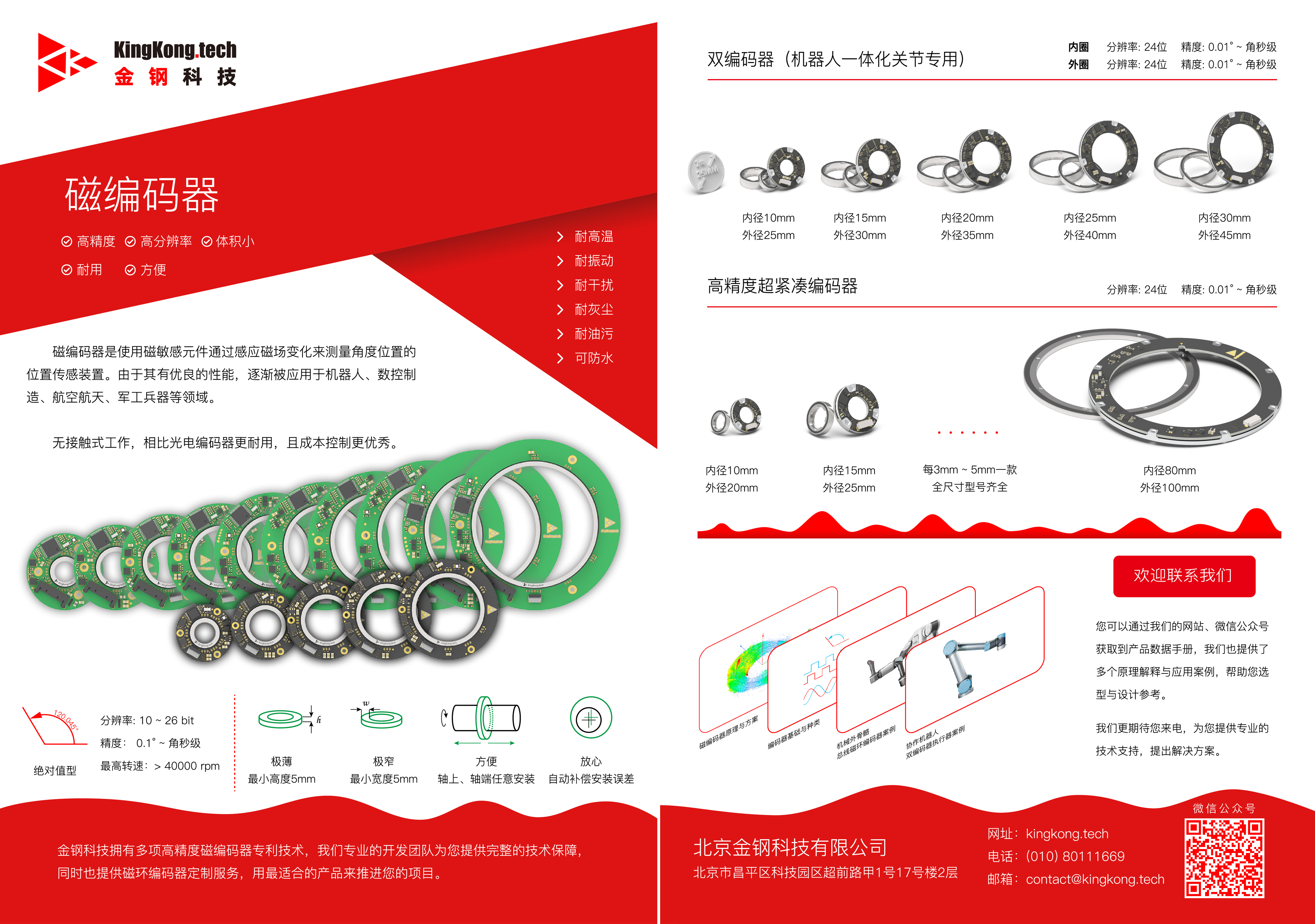 金鋼科技作為機器人零部件的核心供應商,我們的磁編碼器產(chǎn)品可以達到全球最緊湊的尺寸,并提供極高的24位分辨率與角秒級精度,有耐高溫、耐振動、耐干擾、耐灰塵、耐油污、可防水的技術特性,中空的形制設計,滿足便捷安裝和調(diào)試的使用需求,其技術參數(shù)、尺寸大小和適配度更是磁編碼器的極致體現(xiàn),滿足絕大多數(shù)應用場景。