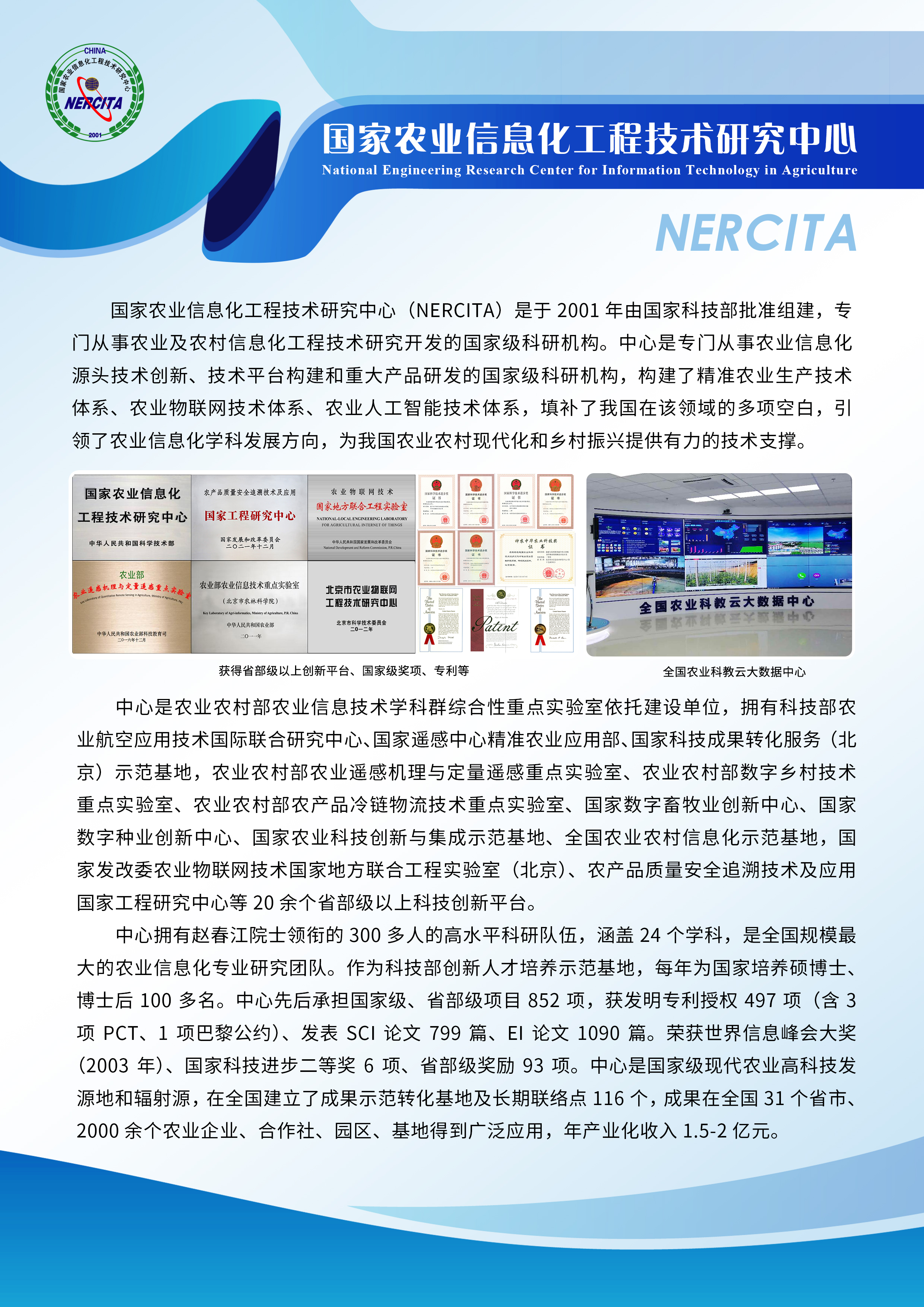 國(guó)家農(nóng)業(yè)信息化工程技術(shù)研究中心(NERCITA)是于2001年由國(guó)家科技部批準(zhǔn)組建,專(zhuān)門(mén)從事農(nóng)業(yè)及農(nóng)村信息化工程技術(shù)研究開(kāi)發(fā)的國(guó)家級(jí)創(chuàng)新平臺(tái)。在中心首席科學(xué)家趙春江院士的帶領(lǐng)下,經(jīng)過(guò)近30年的建設(shè)發(fā)展,中心已成為國(guó)內(nèi)外農(nóng)業(yè)信息科技和智能裝備研發(fā)高地,農(nóng)業(yè)數(shù)字技術(shù)革命和智慧農(nóng)業(yè)發(fā)展的重要推動(dòng)者。 中心的主要任務(wù)是針對(duì)我國(guó)農(nóng)業(yè)強(qiáng)國(guó)建設(shè)與鄉(xiāng)村振興的重大需求,重點(diǎn)圍繞農(nóng)業(yè)傳感器與定量遙感技術(shù)、農(nóng)業(yè)智能決策與信息管理技術(shù)、精準(zhǔn)作業(yè)技術(shù)與智能裝備、農(nóng)業(yè)生物環(huán)境智能控制技術(shù)、農(nóng)產(chǎn)品質(zhì)量安全控制與智慧物流等五大方向,進(jìn)行源頭技術(shù)創(chuàng)新、技術(shù)平臺(tái)構(gòu)建和重大產(chǎn)品研發(fā),全國(guó)智慧農(nóng)業(yè)發(fā)展和數(shù)字鄉(xiāng)村建設(shè)提供科技支撐。