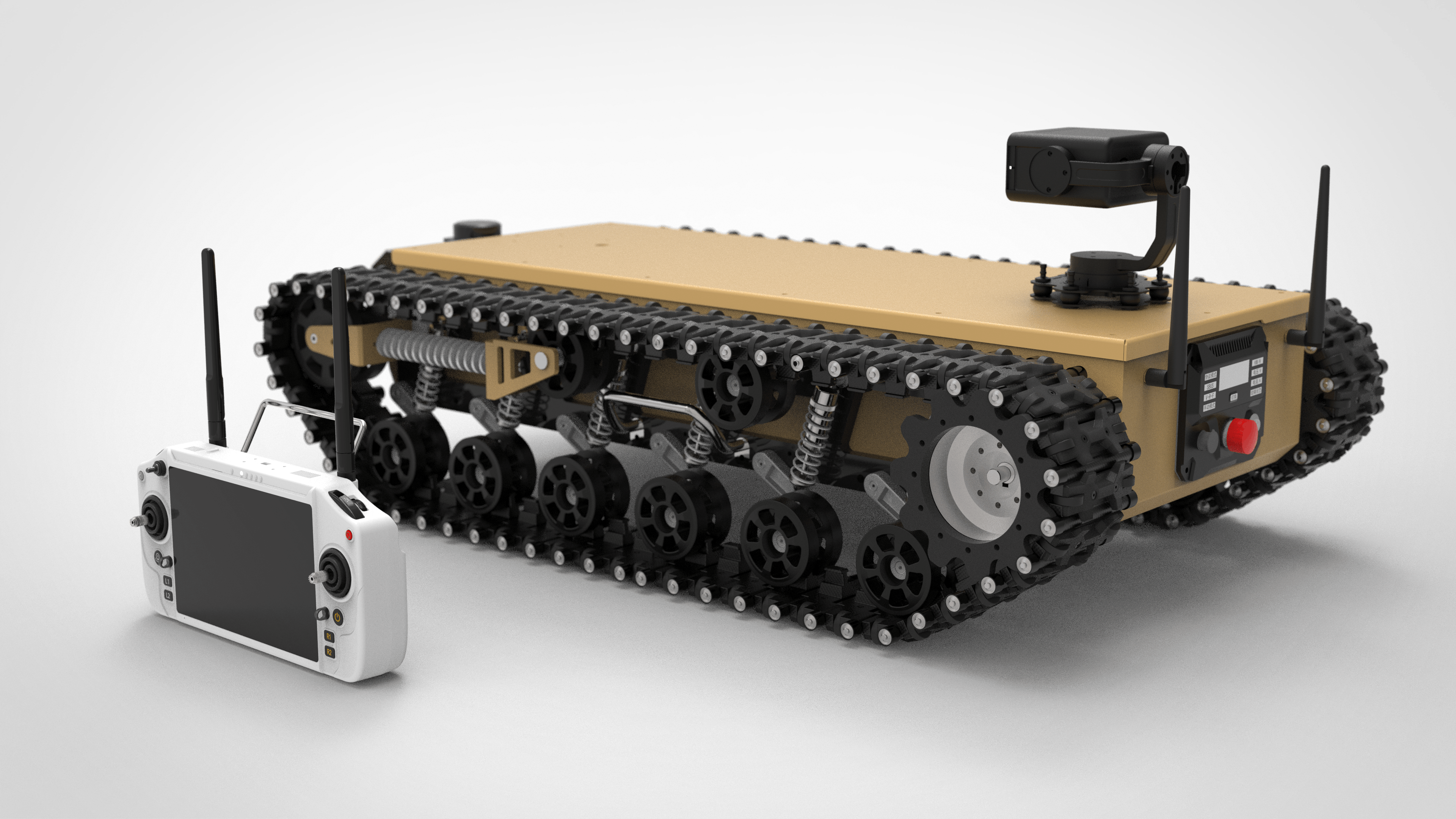 Komodo-ZERO履帶式機器人底盤是一款輕量化,小型高速移動機器人底盤,整車采用特制的低滾阻節式履帶,原地轉向功率小,車身采用全鋁制車架和碳纖維懸掛,搭載空心杯直流伺服電機和行星減速機,直線行使可滿足最大20KM/H速度,自重小于50KG。可滿足小型偵查類機器人越野性能及平穩性能的超高要求,安裝12枚油壓阻尼避震器,配合履帶獨特設計的內外花紋,保持地面抓地力的同時,具有更加平順的通過性能。
